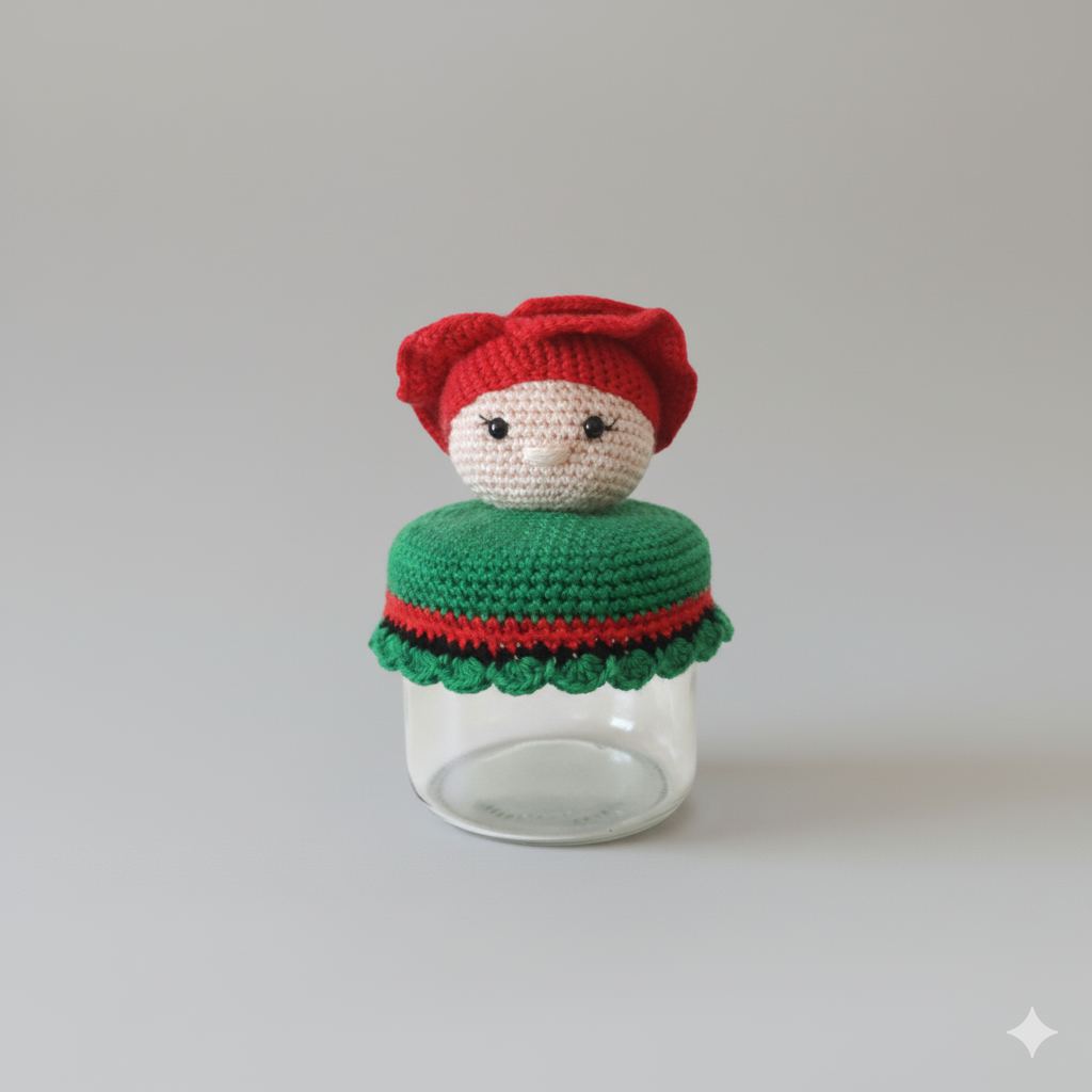 Mijn verhaal: Ik ben met veel liefde en oog voor detail gehaakt, waarbij elk steekje bijdraagt aan mijn unieke persoonlijkheid. Mijn bovenkant is gevormd als een zachte, helderrode klaproos, met een lieflijk gezichtje en een kenmerkend zwart hart in het midden, net als de echte bloem. Mijn kraagje is frisgroen, als de stengel van een klaproos, en ik draag een subtiele rand die mijn charme compleet maakt. Het glazen potje onder mij wacht om gevuld te worden met jouw favoriete schatten, of het nu kleurrijke snoepjes zijn, kleine briefjes, of misschien wel gedroogde bloemblaadjes. Ik ben gemaakt om de ongerepte schoonheid en de spontane vreugde van de natuur te verspreiden.