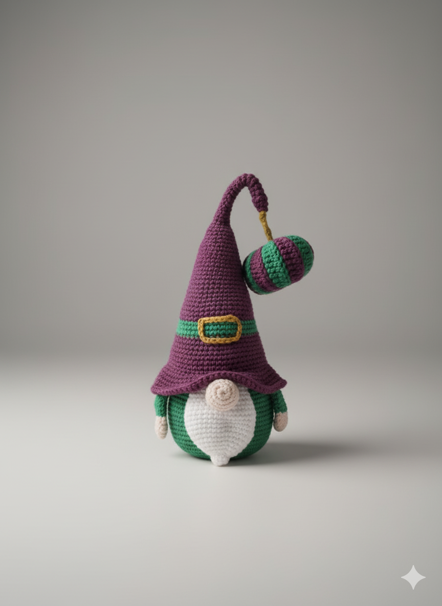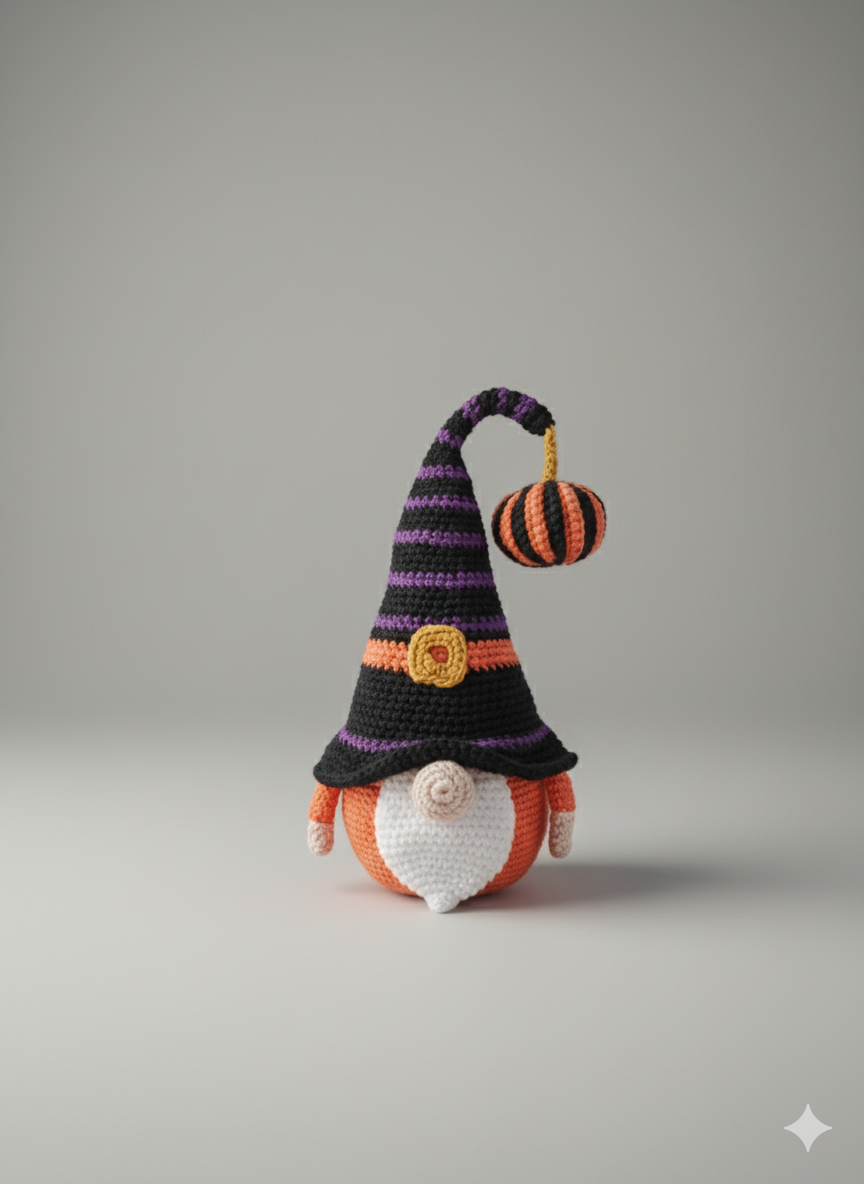 Mijn verhaal: Ik ben met veel liefde en oog voor detail gehaakt, waarbij elk steekje bijdraagt aan mijn unieke persoonlijkheid. Mijn hoed is prachtig gestreept in de klassieke Halloweenkleuren paars en oranje, en is versierd met een sierlijke gouden gesp. Aan mijn muts hangt zelfs een klein pompoentje; mijn persoonlijke Halloween-schat! Mijn buikje is warm oranje, als een lachende pompoen, en mijn zachte, witte baard maakt mijn look compleet. Ik ben gemaakt om de spanning, de gezelligheid en de speelsheid van Halloween te vangen en te delen.