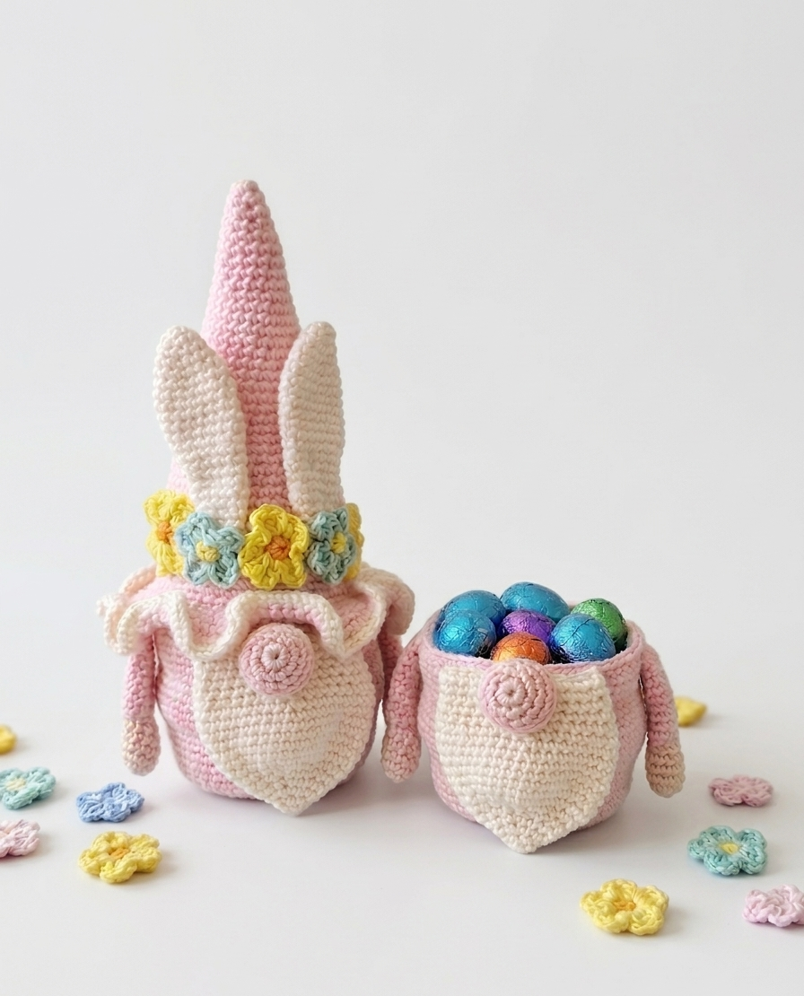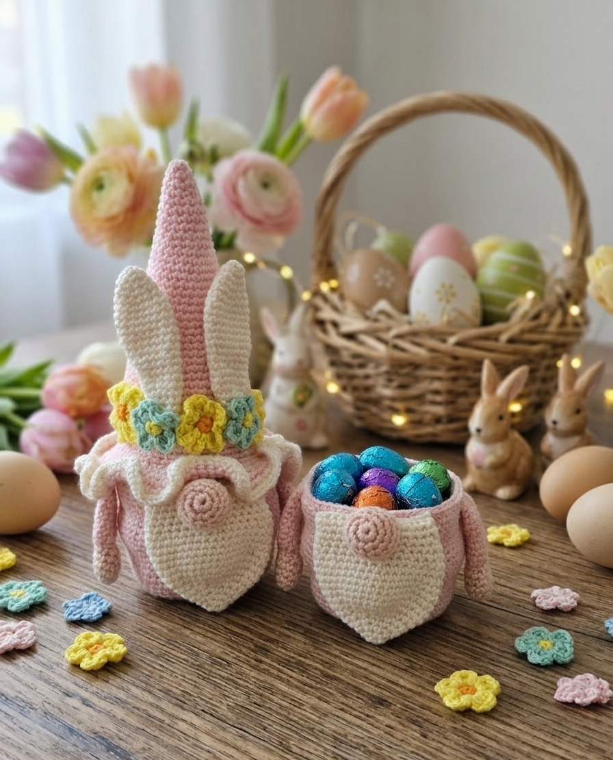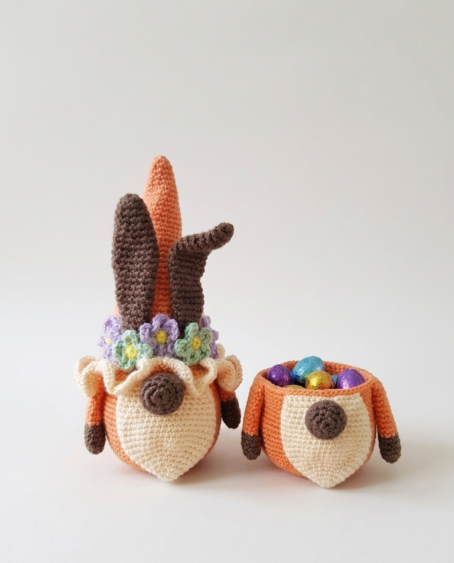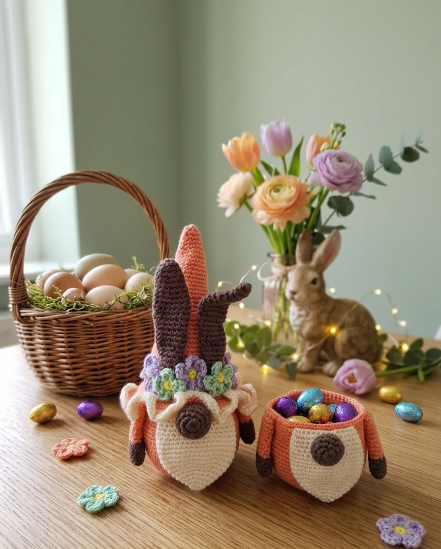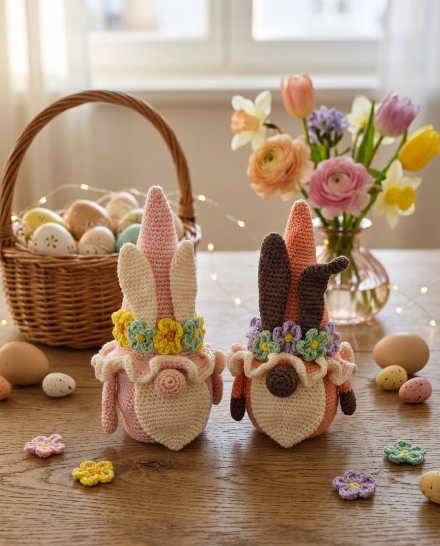 Ons verhaal: Wij zijn met veel liefde en oog voor detail gehaakt. Waar andere gnooms alleen maar mooi staan te wezen, zijn wij ook heel praktisch. Onze mutsen—versierd met lentebloemen en van die heerlijk lange hazenoren—kunnen eenvoudig van ons lijfje worden gehaald. Daaronder schuilt een handige opbergruimte die je kunt vullen met je favoriete chocolade-eitjes of andere kleine paasverassingen. Met onze zachte baarden en bruine accenten zijn wij de sterren van elke paastafel.