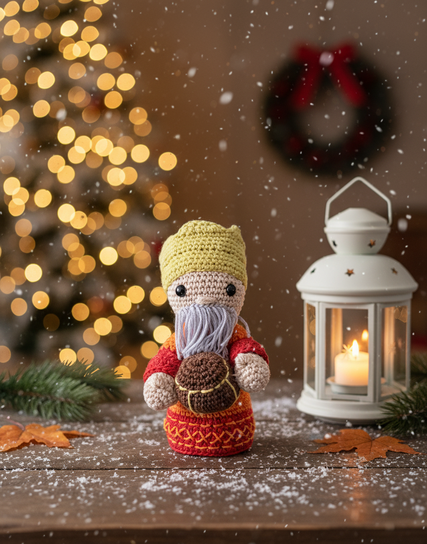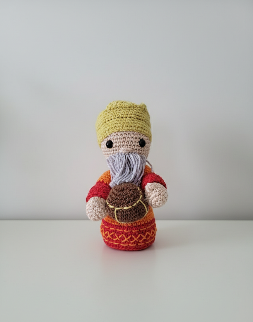 Melchior, de wijze met goud, bracht eer aan het Kind als koning. Hij staat symbool voor wijsheid, ervaring en het delen van rijkdom. Dit gehaakte figuurtje brengt betekenis en traditie in je kerststal — een kleine herinnering aan geven en geloven.