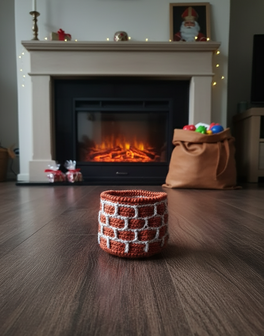 Mijn Verhaal: Ik ben met veel liefde en oog voor detail gehaakt, waarbij elk steekje bijdraagt aan mijn charmante en realistische uitstraling. Mijn buitenkant is zorgvuldig vormgegeven als een echte bakstenen schoorsteen, compleet met grijze voegen die mijn karakteristieke uiterlijk benadrukken. Binnenin ben ik een knus holletje, perfect om kleine briefjes, wensen, of zelfs een symbolisch cadeautje van de Pieten te bewaren. Ik ben gemaakt om de opwinding van het wachten op Sinterklaas en de vrolijke chaos van de pakjesavond te symboliseren en te delen.